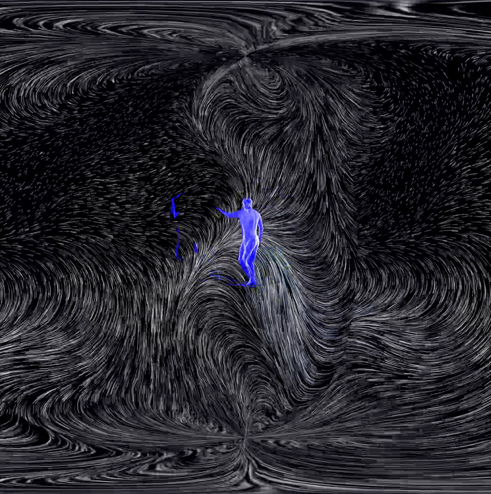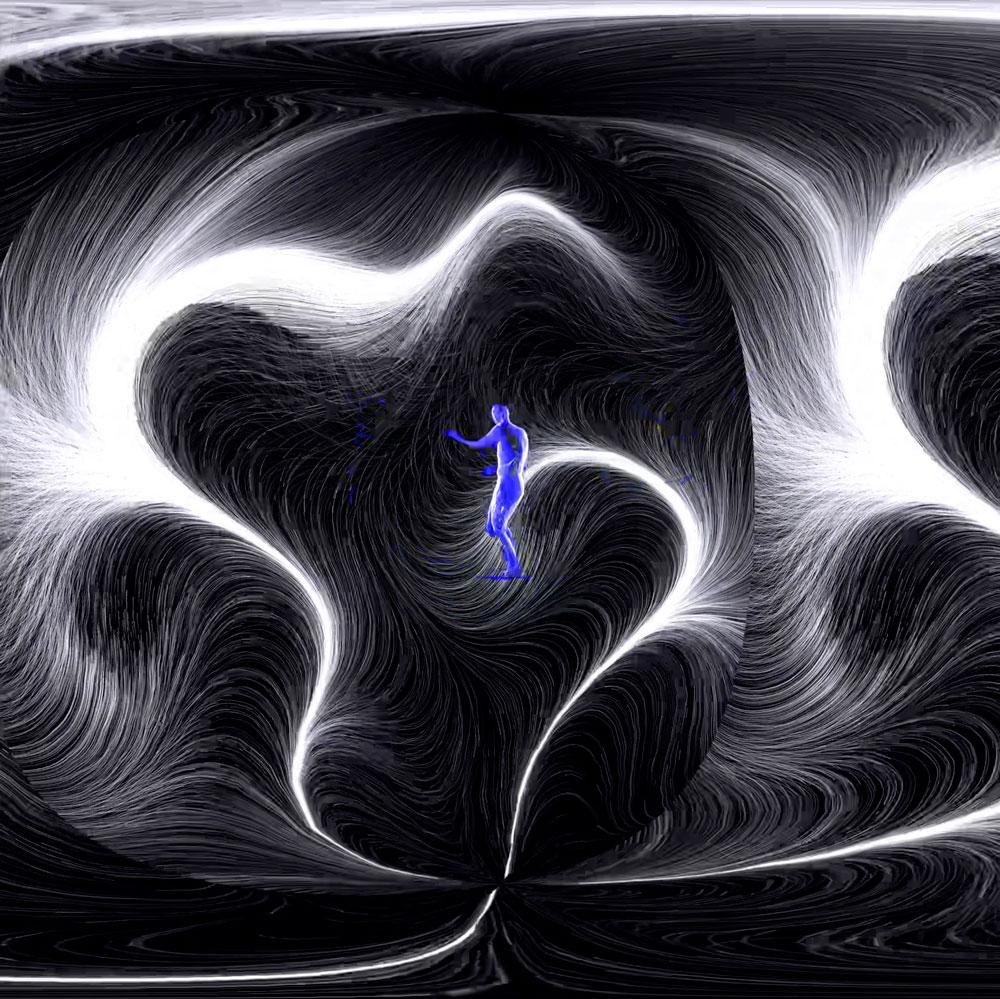 Una línea horizontal proyectada en la pantalla tiembla. De repente, la línea se multiplica drásticamente como si descargara su energía inmanente. Del mismo modo, cuando Hiroaki Umeda tiembla en el escenario, la energía oculta retenida en su cuerpo se transmite desde la pelvis a la columna vertebral, a los brazos, y finalmente a la pantalla, en la que la energía se visualiza mediante líneas curvas que recuerdan una corona solar.